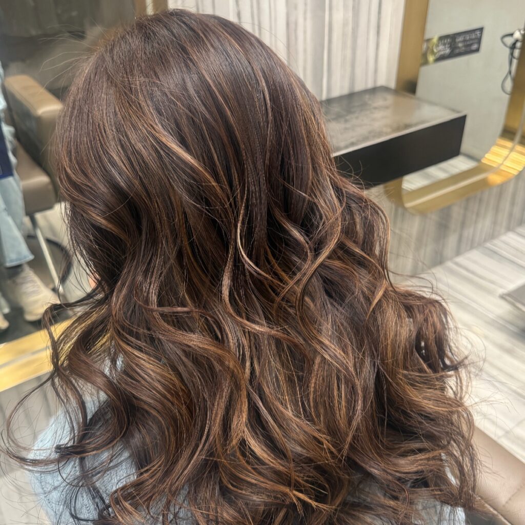 中長層次剪裁搭配自然鬆軟的大波紋捲度,展現輕盈立體的髮型輪廓。 髮色以暖調可可棕為基底,融合細緻線條挑染,在光線下呈現溫潤通透的高質感層次。