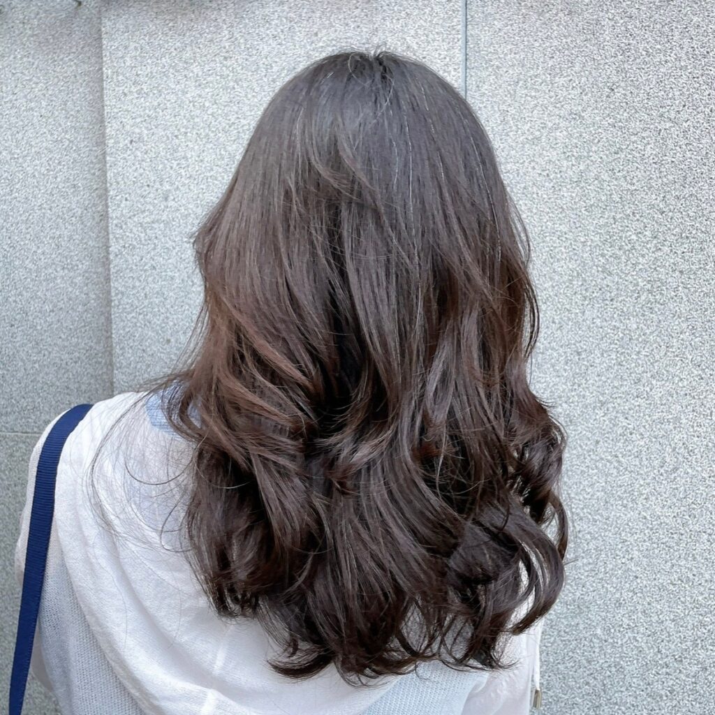 霧感奶灰色讓人皮膚更顯白皙 搭配中長層次剪裁灰霧色隨著 髮絲擺動視覺時尚感