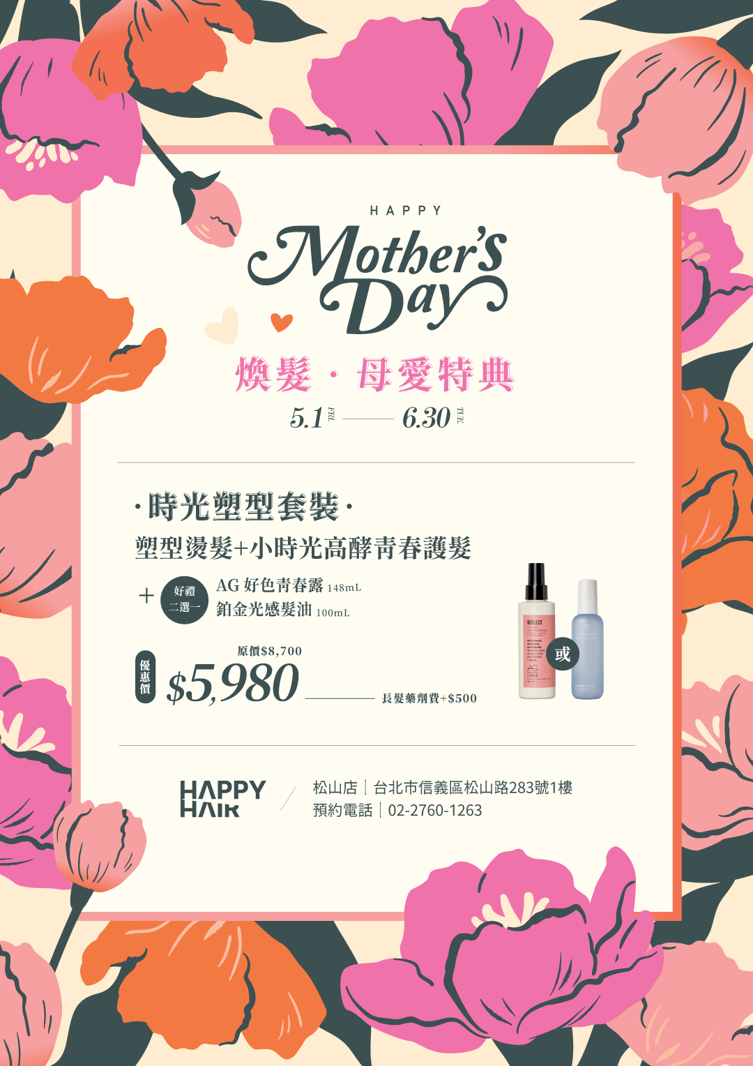 2026. 4. 24 松山店|母親節專屬燙染優惠 最新優惠/HAPPYHAIR松山 上一篇 文章分類 品牌新聞(36) 最新優惠(137) 最新文章 松山店|母親節專屬燙染優惠 2026. 4. 24 市府店|母親節專屬燙染優惠 2026. 4. 24 北屯店|歡慶50限定優惠 2026. 4. 16 ARTICLE 推薦文章 2026. 4. 24 市府店|母親節專屬燙染優惠 最新優惠 more 市府店|母親節專屬燙染優惠 2026. 4. 16 北屯店|歡慶50限定優惠 最新優惠 more 北屯店|歡慶50限定優惠 2026. 4. 16 崇德店|歡慶50限定優惠 最新優惠 more 崇德店|歡慶50限定優惠 文章分類 品牌新聞(36) 最新優惠(137) 最新文章 松山店|母親節專屬燙染優惠 2026. 4. 24 市府店|母親節專屬燙染優惠 2026. 4. 24 北屯店|歡慶50限定優惠 2026. 4. 16